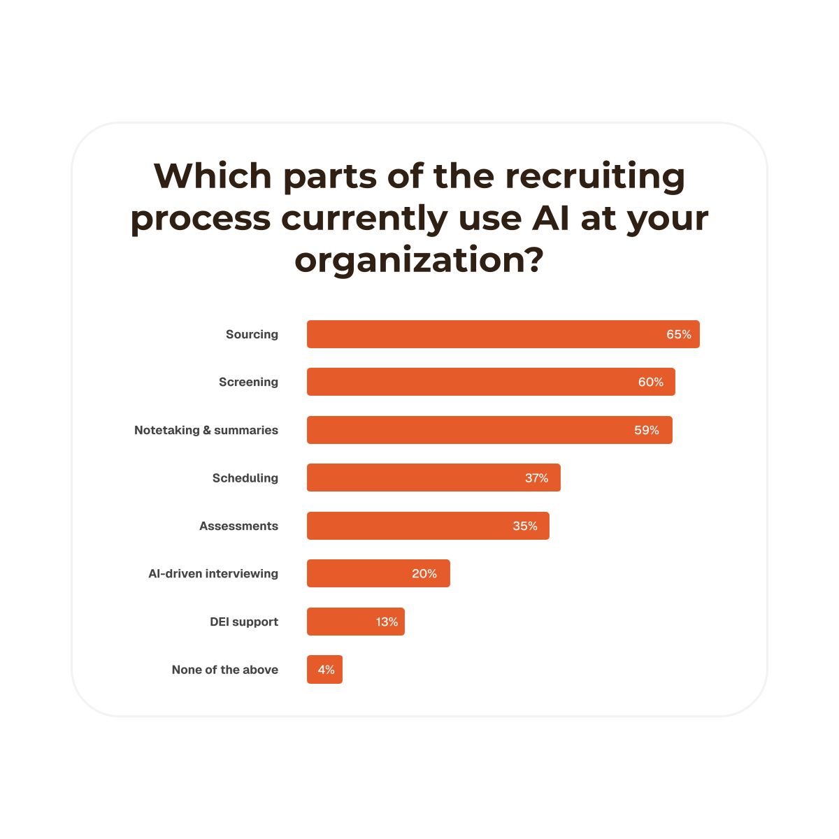 More advanced use cases like AI-driven interviewing or assessments are far less common. That's where risk, bias concerns, and candidate experience concerns collide. Teams are experimenting, but most are doing it cautiously.